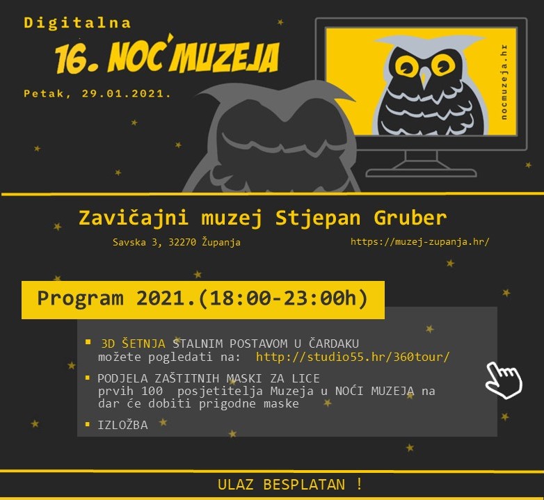 U sklopu skromnog, ali posebnog programa i uz pridržavanje svih epidemioloških mjera, Zavičajni muzej Stjepan Gruber ostaje otvoren od 18:00 do 23:00 sata za sve koji su u mogućnosti doći.