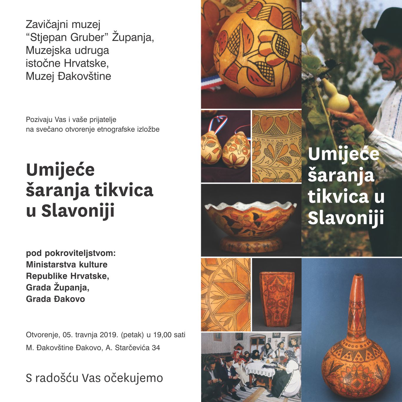 U petak, 05. travnja 2019. godine u 19.00 sati u Muzeju Đakovštine bit će svečano otvorenje etnografske izložbe Umijeće šaranja tikvica u Slavoniji. Izložbu organizira Zavičajni muzej ''Stjepan Gruber'' Županja u suradnji s velikim brojem muzeja diljem Slavonije. U prosincu 2017. godine izložba je predstavljena domaćoj publici u Županji, dok je u svibnju 2018. godine gostovala u Gradskom muzeju u Vukovaru povodom festivala SVI zaJEDNO HRVATSKO NAJ.